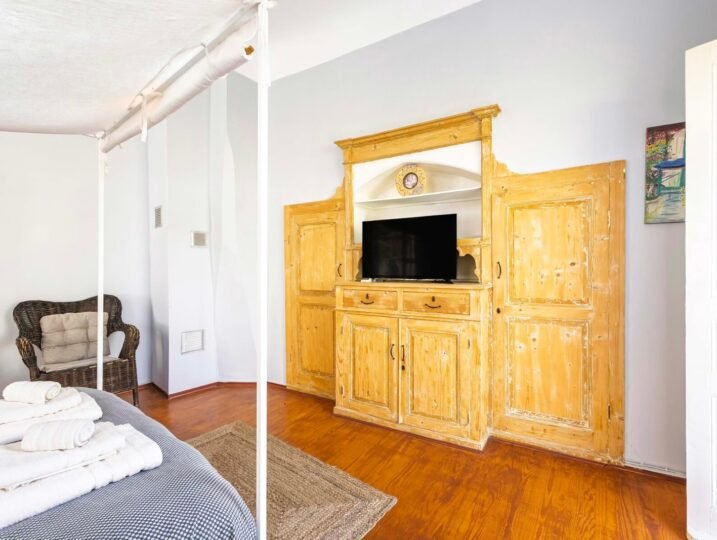 Upstairs, the bedroom invites you with its in-built antique wardrobe and a comfortable 1.60 x 2.00 bed. The room opens onto a private balcony, ideal for sipping your morning coffee while taking in the vibrant neighborhood. The air-conditioned bedroom also features satellite TV and wooden floors that enhance the warm and inviting ambiance, while several windows fill the space with natural light.