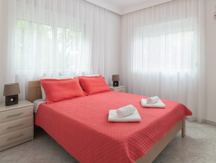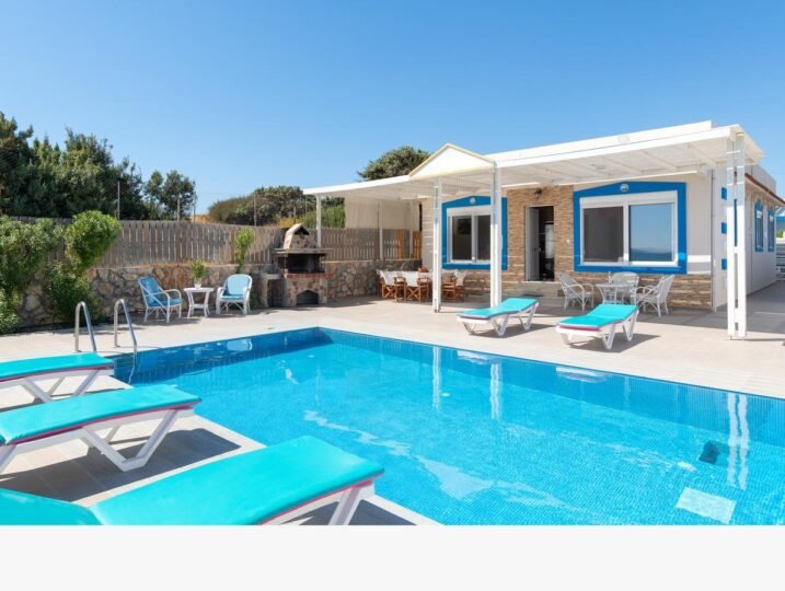 Located in front of the sparkling Mediterranean Sea, with a beach hat and sun beds waiting for you, this villa offers everything you need to enjoy the most valuable time at your holiday’s. The villa boasts a private infinity pool, measuring 3.5 x 7 meters, where you can cool off and relax while taking in the breathtaking views of the sea. An outdoor shower with warm water is also available, providing you with the perfect refreshment after a dip in the pool. The property is situated on enclosed grounds, surrounded by a wall and with a private entrance, ensuring your privacy and security. The owner of the villa lives on the premise, adding a personal touch to your stay. There is also a second private fenced pool villa on the premise, allowing for a total accommodation of up to 16 people. Each villa has its own pool, making it ideal for large families or groups of friends who want to spend their holiday together but still have their own private space. Located in the scenic south of the island, this newly built, self-catering, three-bedroom holiday beach house offers all the modern amenities you could possibly need. The spacious bedrooms are beautifully decorated and equipped with comfortable beds to ensure a good night’s sleep. The two bathrooms are modern and stylish, with one featuring a bathtub for a relaxing soak after a day at the beach. As this villa is located in a remote area, a car rental is mandatory. However, this is the perfect opportunity to explore the stunning surroundings and discover hidden gems of the island. The villa can assist you in arranging a local car rental, so you can easily explore the area at your own pace. Imagine waking up to the sound of waves crashing on the shore, enjoying a cup of coffee on your private terrace, and then taking a refreshing swim in your own pool before heading out to explore the island. And when the day is over, you can come back to your private oasis, where you can enjoy a delicious barbecue dinner under the stars. Don’t miss out on the opportunity to experience a luxurious beachfront holiday at this stunning 4 bedroom villa. Book now and start counting down the days until you can relax in front of the sparkling Mediterranean Sea, with a beach hat and sun beds waiting for you. Your dream holiday awaits at this private paradise.