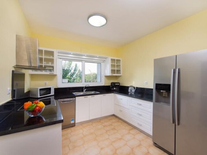 Inside, Villa Dora continues to impress with its stylish, contemporary design, accented by neo-classical elements and handpicked artwork. The ground floor features a spacious open-plan living area, complete with plush sofas, a 42” 3D Smart TV, and a 2.1 home cinema system—ideal for watching your favorite sports or movies. Entertainment options also include a PlayStation 3 and a selection of DVDs. The modern, fully-equipped kitchen with an American-style fridge freezer and chic dining area offers the perfect space for family meals.