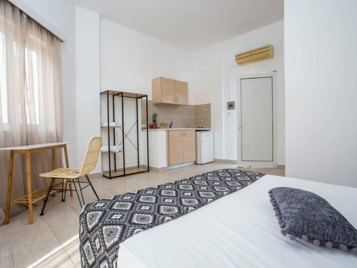 Each of our 11 studios is designed to offer the perfect blend of style and functionality, ensuring a comfortable and memorable stay. With modern amenities such as en-suite bathrooms, private balconies to soak up the Greek sunshine, and fully equipped kitchenettes, every detail is tailored to ensure your stay is as comfortable as it is memorable.